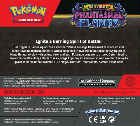 Searing blue flames rip across a dark battlefield as Mega Charizard X ex soars up and looks down upon its opponents! With a deep chill to rival the heat, the shadowy figure of Mega Gengar ex slowly rises into view, and both Pokémon prepare to attack. Determined to prove their mettle, Mega Heracross ex, Mega Lopunny ex, and even more Pokémon line up to give it their all in the Pokémon TCG: Mega Evolution— Phantasmal Flames expansion!